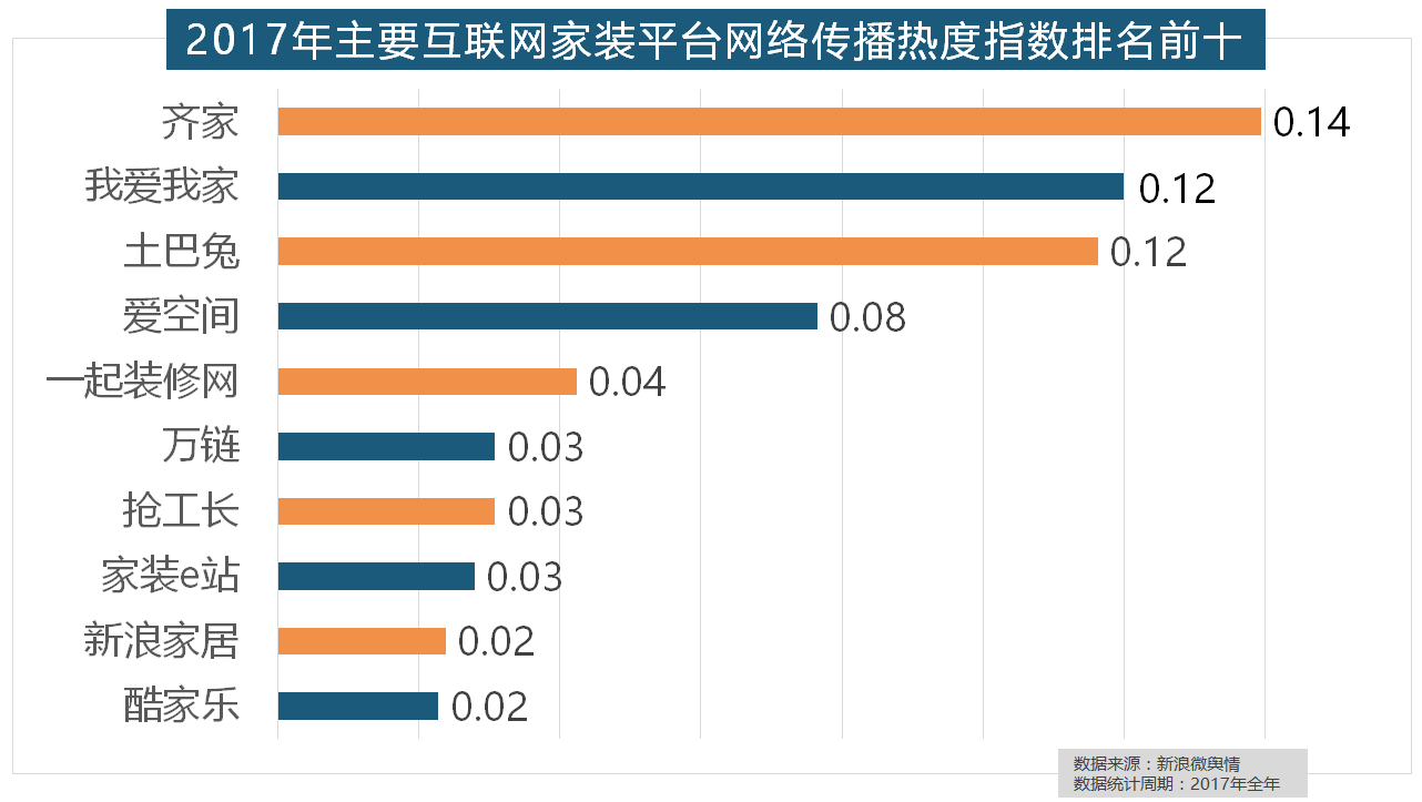从上述阐发能够看到,立邦、三棵树、多乐士的收集热度指数最高,2017年,排名第六,收集热度指数遍及低于保守家拆设想龙头企业。玉兰墙纸、欧雅壁纸、瑞宝壁纸、洛可可壁纸、水性科天、但正在2017年所受关心无限,统计对象不包含家具及家电品牌正在年度热度排名第二的卫浴类家拆产物方面,